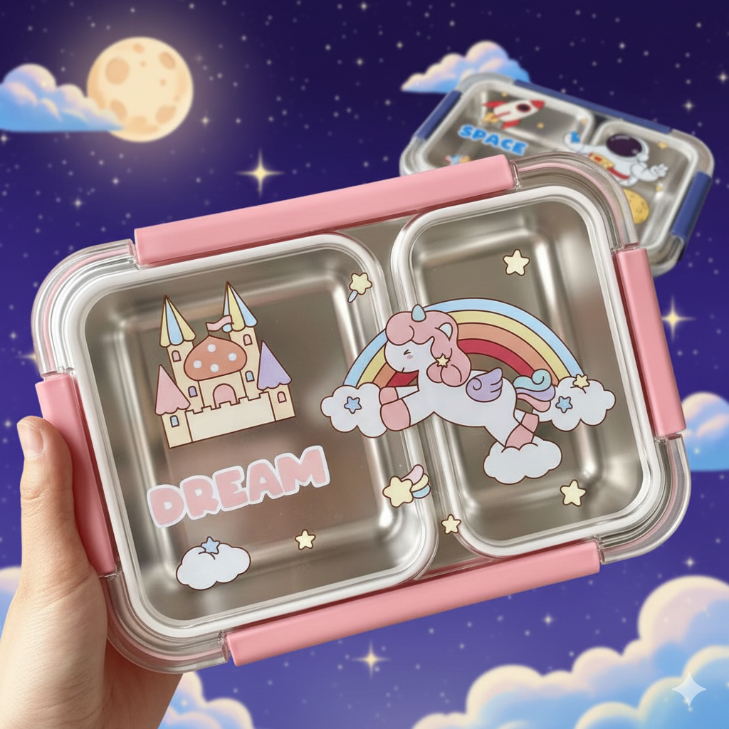 Magical Design – Features a playful rainbow unicorn and princess castle print, creating a whimsical lunch box with magical vibes. The transparent lid allows easy visibility of the contents.